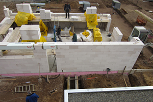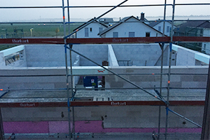 Jetzt ist bereits das OG soweit fertiggestellt, hier vor dem sog. „Jochen“ für die Verlegung der Filigrandecke.